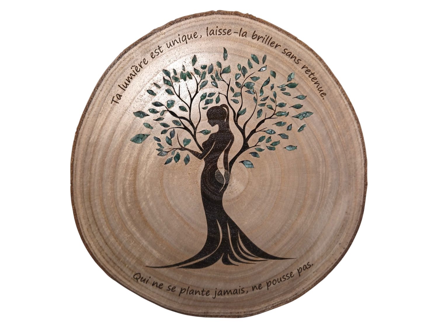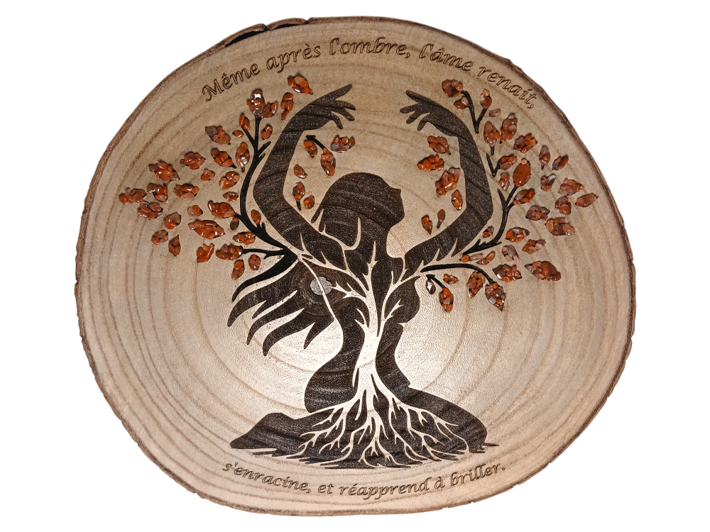 Tableau en rondin de bois incrusté de cornaline, une pièce unique qui allie la chaleur naturelle du bois brut à l'éclat minéral de la cornaline. Chaque détail est travaillé à la main pour créer un objet de décoration authentique et intemporel.
