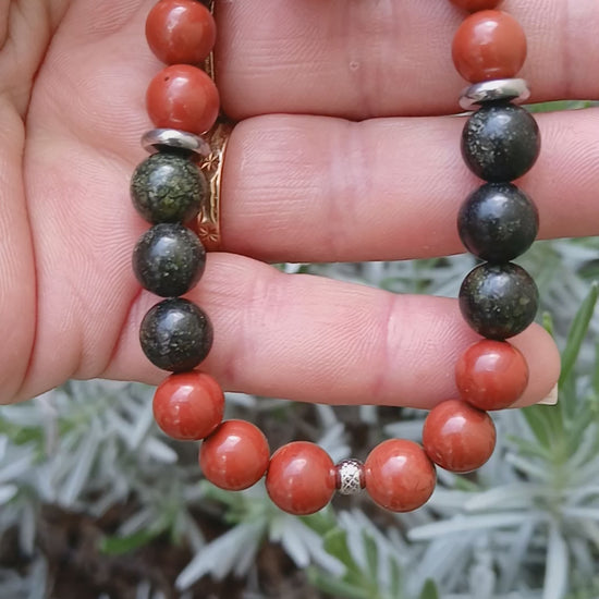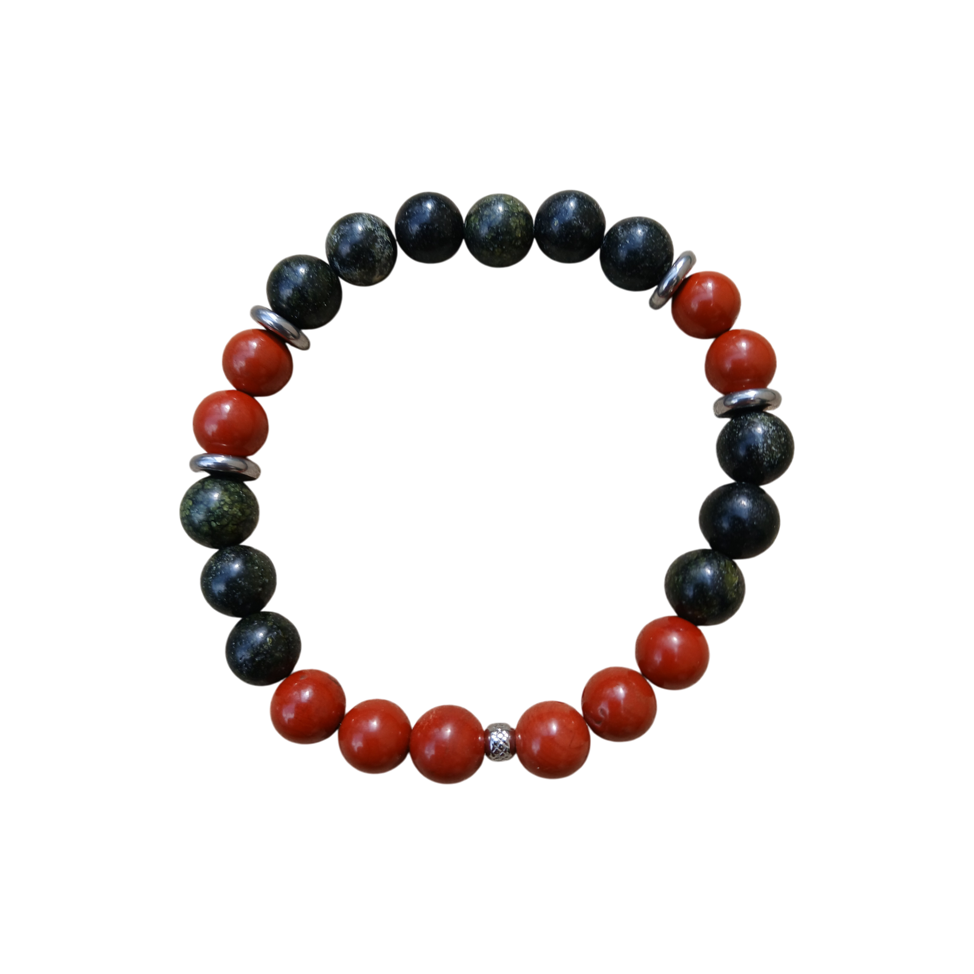 Vibrant et équilibré, ce bracelet associe la puissance du Jaspe rouge à l’énergie régénérante de la Serpentine.